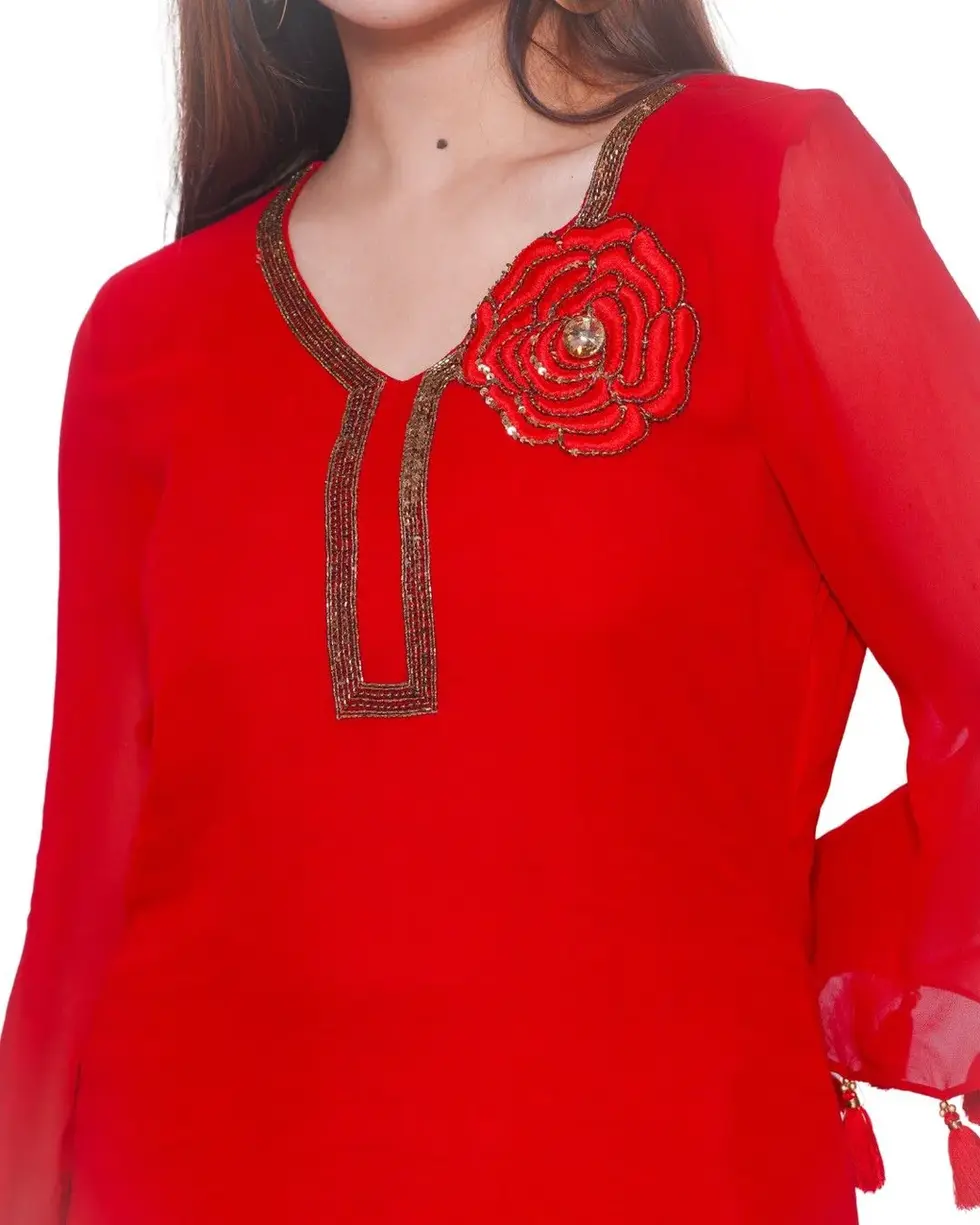 Bold and elegant crimson red georgette kurti set adorned with intricate thread and cutdana work, tassel detailing, and paired with crepe bell-bottom pants. Comes with soft shantoon lining for all-day comfort