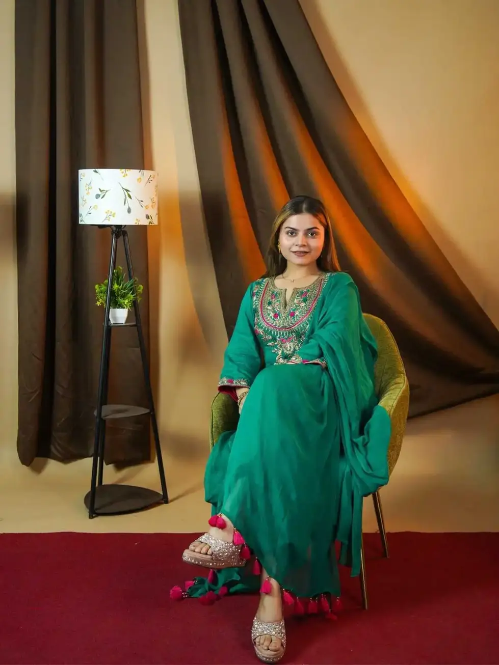 Make a statement this festive season with our Emerald Green Pure Chiffon A-Line Suit, adorned with exquisite dabka embroidery, paired with a tassel-detailed chiffon dupatta and crepe pants for a graceful and regal look.