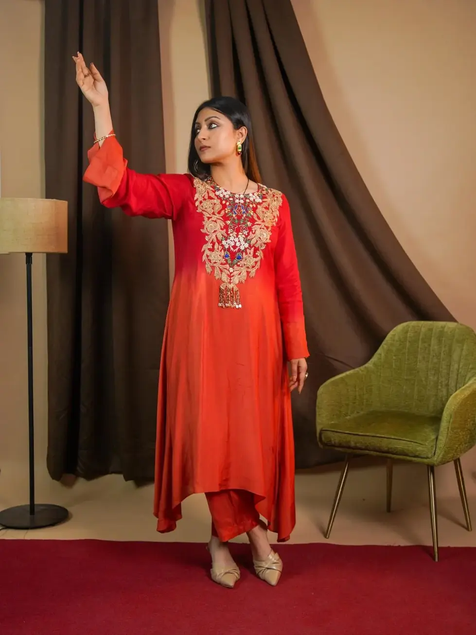 Bring effortless elegance to your festive wardrobe with the Rust Radiance A-Line Suit Set from the Jhalak Festive Collection. Designed in premium muslin silk, this ensemble features a rich ombre blend of rust orange and ruby red hues. The flowing A-line kurta, paired with matching pants, is embellished with exquisite zari and cutdana embroidery, adding a touch of royal sophistication. Perfect for weddings, festive gatherings, and celebratory evenings, this outfit blends traditional artistry with contemporary grace.